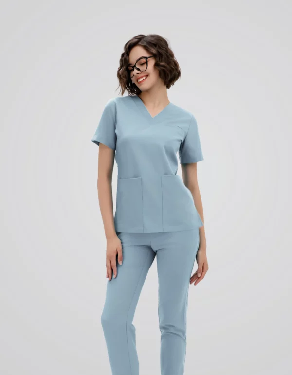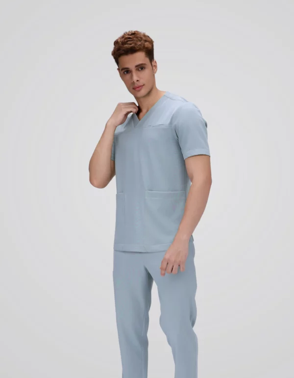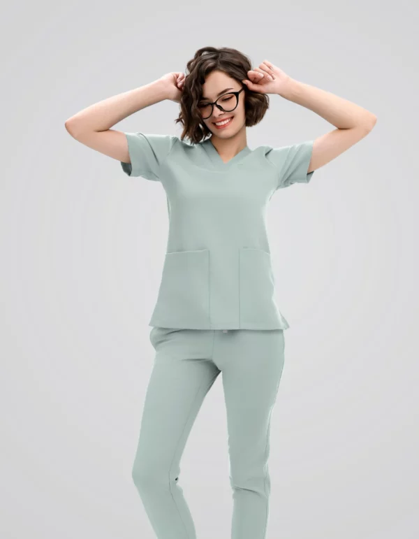 - Kiểu dáng: Áo: Cổ chữ V, có 01 túi âm ở ngực trái và 02 túi nhỏ và 02 túi lớn bên hông, có chi tiết đeo bảng tên bên vai phải. Quần: Lưng thun, có dây rút, 02 túi hai bên hông.
