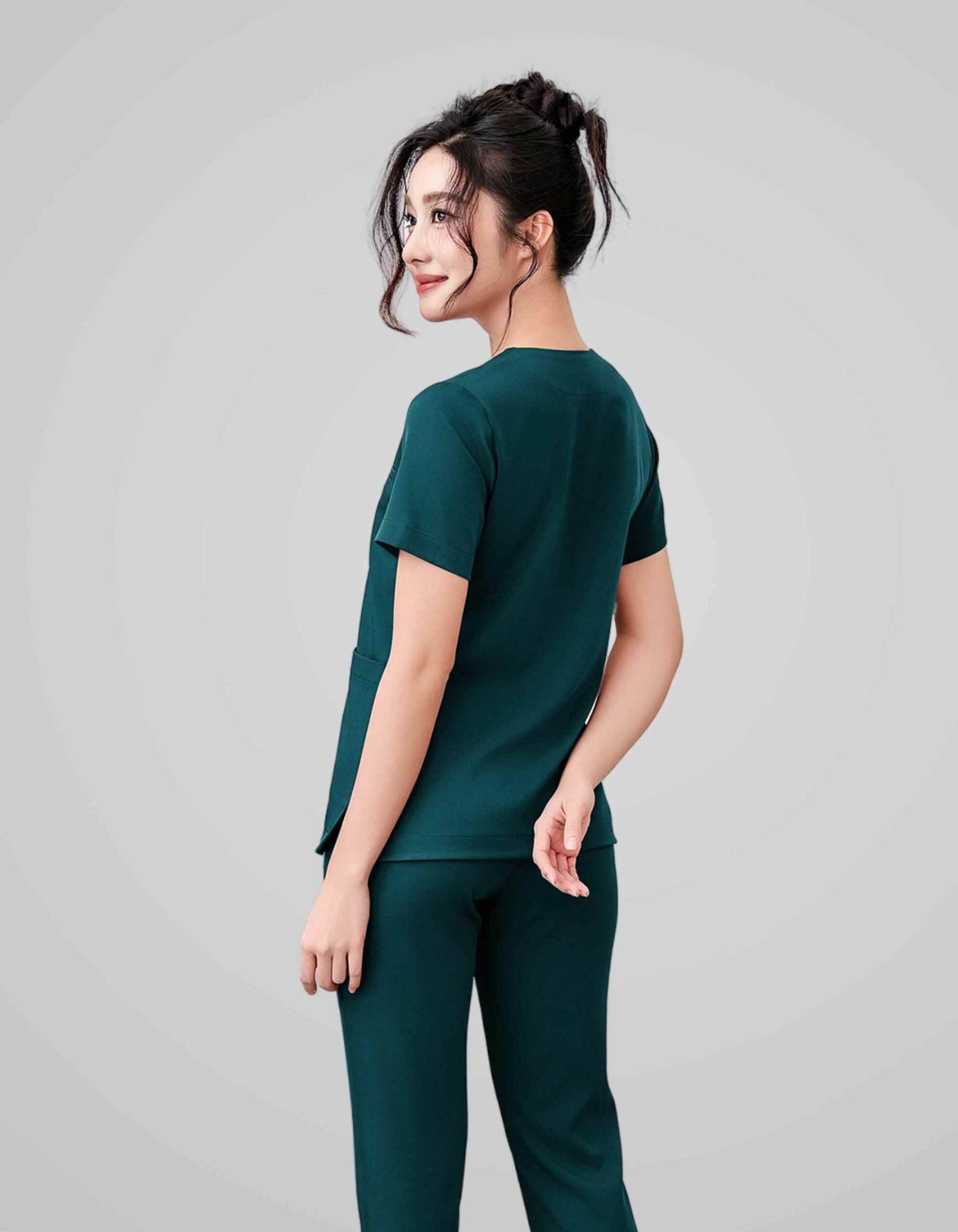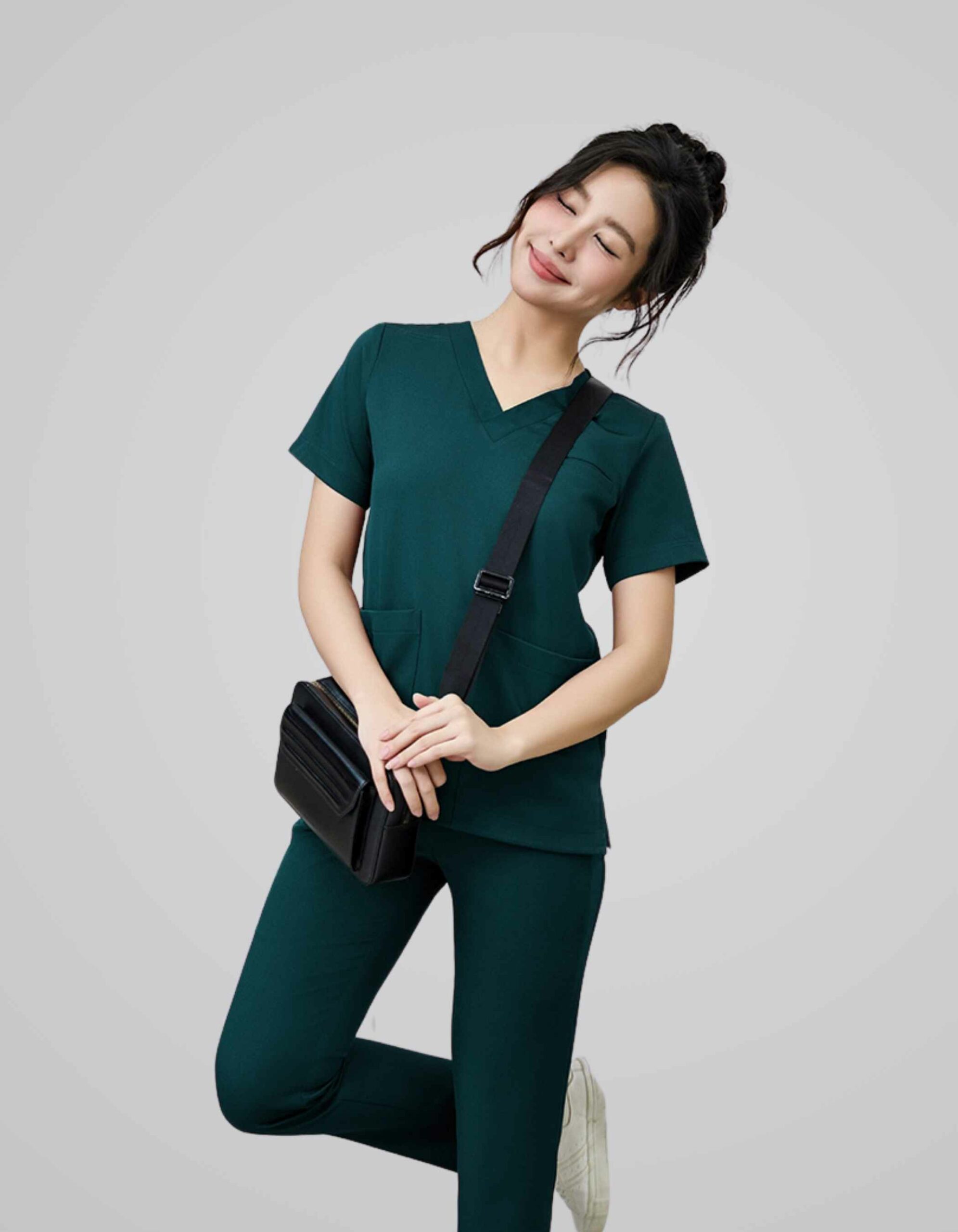 - Kiểu dáng: Áo: Cổ chữ V, có 01 túi âm ở ngực trái và 02 túi nhỏ và 02 túi lớn bên hông, có chi tiết đeo bảng tên bên vai phải. Quần: Lưng thun, có dây rút, 02 túi hai bên hông.